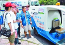 日前,浙江理工大学科技与艺术学院的城市生活垃圾分类处理暑期调研小分队的队员们来到杭州文新环卫所,针对城市主要生活垃圾回收现状进行调查访问,将原创的“垃圾分一分,环境美十分”的宣传图文、袖贴等贴在环卫车和环卫工人的工作服上,以增强广大市民生活垃圾分类处理的环保意识,营造良好氛围,创造低碳生活。通讯员 叶知舟 钱津津 摄