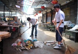 7月16日下午,浙江农林大学工程学院“育人成才先锋”创先争优党支部服务团携手山门镇党员志愿者清洗山门镇各个卫生问题街道,为唱响当地政府发动的“红色七月”贡献了自己的力量。 当天下午1点队员们顶着烈日,在当地新老党员的指导下,同他们一起打扫并清洗山门镇平西路和亭后村菜市场,据山门镇团委副书记白姗姗介绍说,山门镇作为一个生态旅游镇,会定期组织党员志愿者打扫当地街道和菜市场,当地党员志愿者