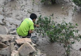 7月13 日,温州大学城市学院“感受湿地文化,争做低碳达人”暑期社会实践队统一身着绿色的队服,从海岛寄宿小学出发步行至位于浙南乐清湾雁荡镇南岙山村的红树林保护区进行实地考察。在行路过程中,我们见到公路正在修建,并在安装管道。烈日下,我们一行人走在干燥的土泥地上,当见到期待已久的红树林时我们都很兴奋。大片大片的滩涂上覆盖着一株株矮小的红树,但分布零散没有形成一定的规模,还有很多红树小树苗,在涂滩上还
