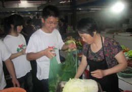 7月13日 早晨7:00,浙江农林大学信息工程学院赴临安太湖源镇“服务新农村建设”暑期社会实践志愿服务团走进太湖源镇农贸商场,访问了市场内的各个农户,并体验起菜农的生活。 在了解市场各个农户的情况后,我们得知有位菜农老奶奶的老伴因为腿疾毛病犯了未能一起来卖菜,队员们得知这一情况后争着帮老奶奶剥起了毛豆,卖起了菜,学着怎样去使用电子秤称斤两,为方便卖菜还记熟各个菜的