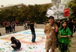 学子行为艺术舞蹈 废物利用展示 一片被砍到的树桩、“冒”着黑气的巨大烟囱……4月18日,这些震撼人心的模拟场面出现在了河南大学校园,在第41个世界地球日来临之际,河大师生举办了一场创意十足的“校园环保世博会”,用行为艺术和废旧模型宣传环保。 环保世博会以“‘球’生之路”为主题,整个世博园区以时间为轴线,用远古时代、农耕时代、工业时代、我们的未来四个部分展示人类活动与自然环境之间的关系