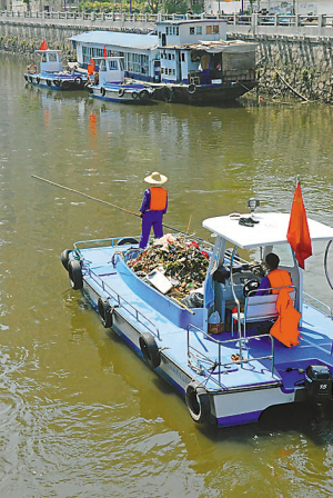 广州市水上市容环卫处的打捞队员们不辞劳苦地捞起江面上的漂浮物,拖走江边的垃圾。