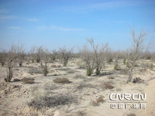 | 最为耐旱的沙枣林。因为生态退化,民勤已有13万亩沙枣林死亡。 |