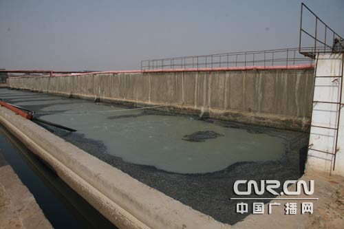 记者:现在我们听到的这水声,就是从米来公司的污水,这污水是黑色的,旁边是大沉淀池,池子里,水是粘稠状的,跟粥一样,上面盖着黑色泡沫……。