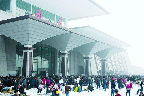 1月29日,新竣工的武昌火车站门前人头攒动。受罕见持续大雪天气影响,不少列车晚点、停发,武昌站有大量旅客滞留。本报记者 鲁伟/摄