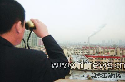 图为哈市道里区环保局工作人员用林格曼黑度测量仪进行环境监测。