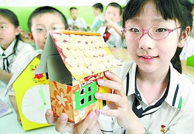 6月4日,一名山东小学生展示用废纸盒制作的“房子”。新华社发图