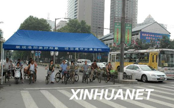 2007年7月3日,在河南洛阳中州路与解放路交叉口,市民在遮阳篷下等红灯。近日,洛阳交警在部分非机动车道上搭起遮阳篷,让市民在炎炎夏日里无需顶着烈日等红灯。新华社发(赵朝军 摄)