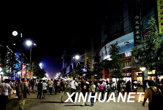 9月23日晚,市民和游客在北京王府井商业街体验事先有预告的“熄灯秀”。作为“节能减排全民大型体验活动”的一项内容,北京王府井地区的部分景观照明,于当日20时至20时30分熄灭半小时。与此同时,部分社区居民的家中,也在一段时间内,关闭不必要的灯光,以亲身体验能源紧缺对日常生活造成的影响。新华社发 (谢庆东 摄)