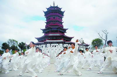 让市民在良好的环境中愉快地工作和生活,是节约型园林的重要内容。图为老人们在杏林阁前表演太极拳。