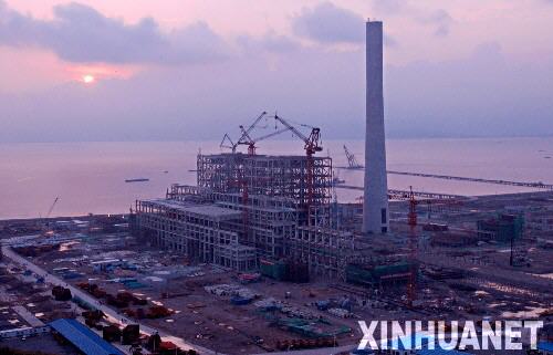 这是晚霞映照下的浙江华能玉环电厂工程外景(2005年9月15日摄)。华能玉环电厂是我国首座装备百万千瓦超超临界发电机组的电厂,规划装机容量为4台百万千瓦超超临界燃煤机组,一期建设2台百万千瓦机组。电力专家指出,这项国家重点工程的节能、环保、节水先进技术代表了我国燃煤电厂的发展方向,为实现电力的可持续发展充当了开路先锋。 新华社发