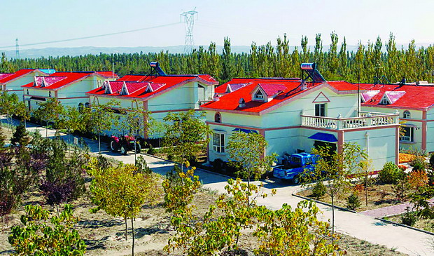 这是宁夏灵武市白芨滩林场职工住宅区。宁夏灵武市白芨滩林场20多年来,有效阻止了毛乌素沙漠的南侵,在治沙过程中将生态效益与经济效益、社会效益相结合,实现了生态文明的和谐发展。[新华社记者 王鹏摄]