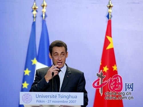 27日,萨科齐总统在清华大学大礼堂发表演讲。(图片来源:中国网)