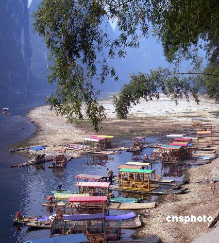 十二月初,广西桂林漓江磨盘山至竹江码头一带因漓江水位下降暂时停航,当地旅游部门组织一些小船载客以满足此地段游客观光。由于近段时间桂林雨量偏少,广西桂林漓江水位下降,航道日渐枯浅,桂林海事局日前已调整漓江游览航线,从以往磨盘山码头出发到阳朔结束的漓江全线游,将调整为杨堤—大爽—杨堤的精华航线游,游船票价也相应做出了下调。中新社发 郭瑞瑞 摄