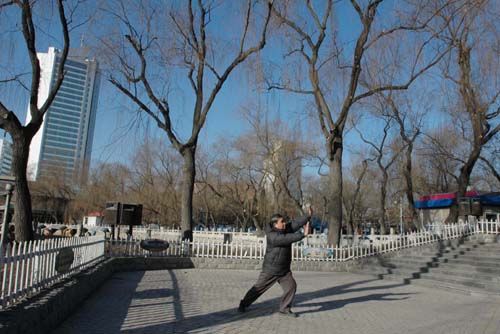 12月29日,一位市民在太原迎泽公园里练太极拳。当日,经过昨晚的一场大风,山西太原市迎来2007年第18个一级天。据山西太原市环境监测中心站消息,截至12月29日,2007年太原市二级以上天气达到267个,刚好达到太原市今年的环境空气质量任务,比去年增加7天。 新华社记者 彭洋 摄