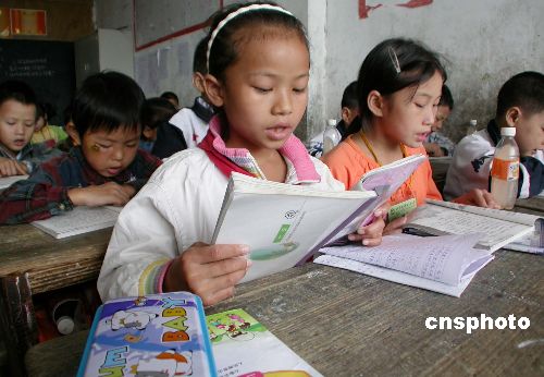 资料图:浙江温岭城东民工子弟小学三(3)班全体同学使用循环教科书在早读。新学期伊始,城东民工子弟小学在校内9个班级400多名学生中全面实施教科书循环使用制度试验。 中新社发 江勇兵 摄