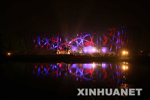 资料图片:国家体育场(鸟巢)在五彩灯光的映照下璀璨亮丽。 新华社记者邢广利摄