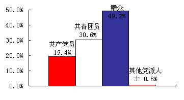 被访者的政治面:共产党员占19.4%;共青团员占30.6%;群众占49.2%;其他党派人士占0.8%。