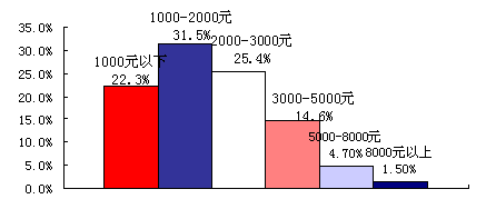 被访者的月收入状况:1000元以下的占22.3%;1000-2000元的占31.5%;2000-3000元的占25.4%;3000-5000元的占14.6%;5000-8000元的占4.7%;8000元以上的占1.5%。从数据结果来看,被访者的月收入主要在3000元以下。