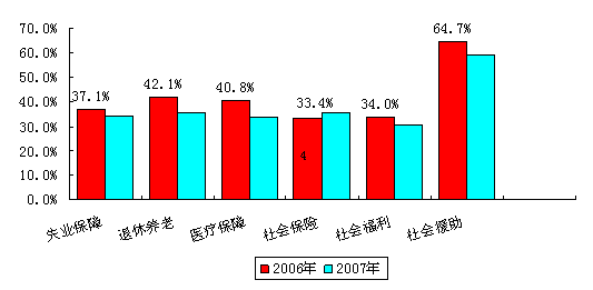 在社会保障方面,公众的调查满意度与2006年数据对比时,只有在“社会保险”一项上数值有锁上升,其余各项较往年满意度均有所下滑。