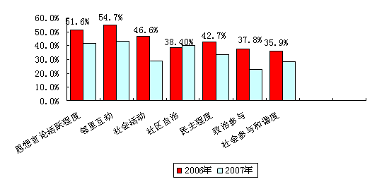 在社会参与方面,调查中“社区自治”较2006年的调查数据有所提升,数据上“社会活动”以及“政治参与”较2006年调查数据下降较大。