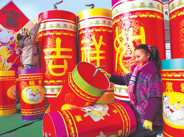春节即将来临,山东省潍坊市一游乐园用废纸壳等材料制作了数个鞭炮模型,既营造出了浓厚的新年喜庆气氛,又使废旧纸壳得到了重复利用。