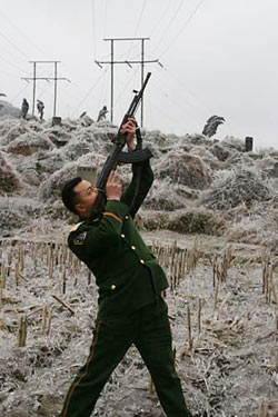 | 2008年1月23日,在黔东南州凯里市,参与抢修电网的武警用冲锋枪击碎电线上厚厚的覆冰。(吴如雄) 来源:CFP |