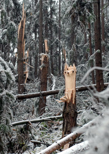 凝冻天气造成贵阳90余万株植物受灾,这是贵阳市南明区凤凰山上被冰雪压断的林木。新华社发