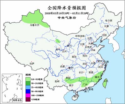 具体预报如下: 11日08时至12日08时,甘肃中北部和西南部、青海东部、西藏东部、川西高原北部、内蒙古东北部和黑龙江西北部等地的部分地区阴有小到中雪(雨)或雨夹雪;四川盆地、云南东北部、贵州大部、湖南西北部、湖北西南部以及台湾等地的部分地区阴有小到中雨或阵雨。新疆北部有5~6级偏北风、山口地区和部分风口地区的风力可达7~8级,西北地区东北部、内蒙古大部有4~6级偏北风或偏南风。甘肃中西部偏北地区、内蒙古中西部、宁夏北部、陕西北部以及新疆南疆盆地等地有扬沙或浮尘天气,部分地区有能见度小于1000米的沙尘暴。 12日08时至13日08时,新疆北部、内蒙古东部、东北地区北部、西藏东部、川西高原局部有小到中雪或雨夹雪,东北地区中南部有小到中雨转雪,其中内蒙古东北部和黑龙江北部的部分地区有大到暴雪;黄淮东部和南部、江淮西部、江汉、江南中西部以及西南地区东部等地阴有小到中雨或阵雨,其中湖南北部、江西北部的部分地区有大雨。新疆北部、宁夏、内蒙古大部、东北地区有4~6级偏北或偏南风。南疆盆地、内蒙古中西部、华北北部等地的部分地区有扬沙或浮尘,局部有沙尘暴,渤海、黄海北部有6~7级阵风8级偏南风转偏北风。 13日08时至14日08时,新疆北部、东北地区东部、青海南部、西藏东部、川西高原等地的部分地区有小到中雪(雨)或雨夹雪,其中,新疆北部、黑龙江东部局部有中到大雪;西南地区东部、江南大部、华南西北部以及台湾等地阴有小到中雨或阵雨。新疆北部、内蒙古大部、东北地区东部等地有4~6级偏北或偏南风;渤海、黄海中北部有6~7级偏北风。