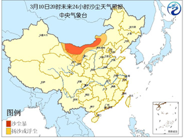 中央气象台今天早晨6时继续发布《沙尘天气预报》:受东移冷空气的影响,预计今天白天到夜间,甘肃中西部偏北地区、内蒙古中西部、宁夏北部、陕西北部以及新疆南疆盆地等地有扬沙或浮尘天气,部分地区有能见度小于1000米的沙尘暴。