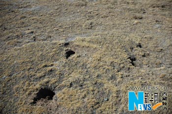 高原鼠兔肆虐打洞,草原上"满目疮痍"。 新华社记者 胡星 摄