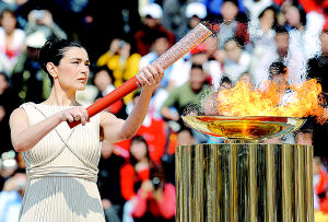 3月30日,北京奥运会圣火交接仪式在雅典1896年首届现代奥运会会场举行。图为最高女祭司在交接仪式上。
