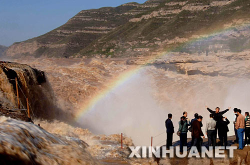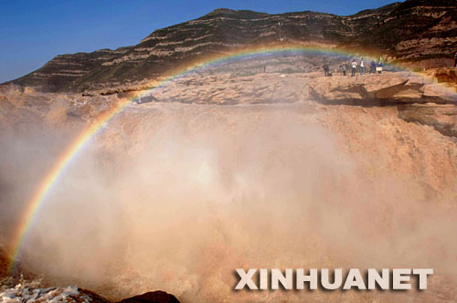 金秋时节,受黄河中游地区连日降雨影响,壶口瀑布水量剧增,河水以每秒2000多立方米的水量咆哮奔泻,使壶口两岸形成千米宽的瀑布群。雨后初霁,艳阳高照,壶口瀑布出现美丽的彩虹,让游客流连忘返。 新华社记者陶明摄