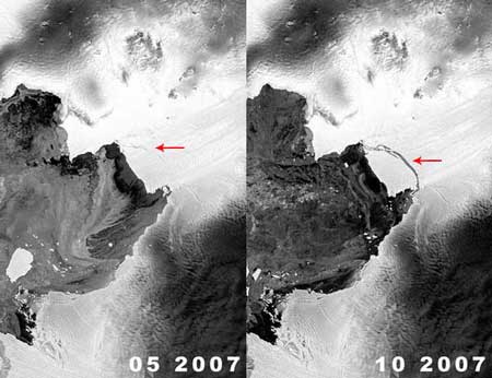 据国外媒体报道,借助于去年和今年拍摄的一组卫星照片,科学家发现了南极一座新形成的冰山。这组照片清晰地显示出南极洲一座冰山从其母体冰川上断裂,并漂向大海的过程。
