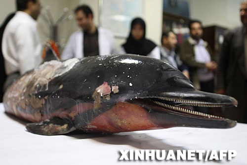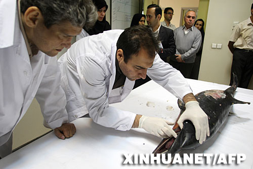 10月29日,在伊朗首都德黑兰,生物学家和环保人士检查被海水冲刷上岸的海豚尸体。新华社