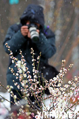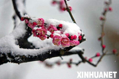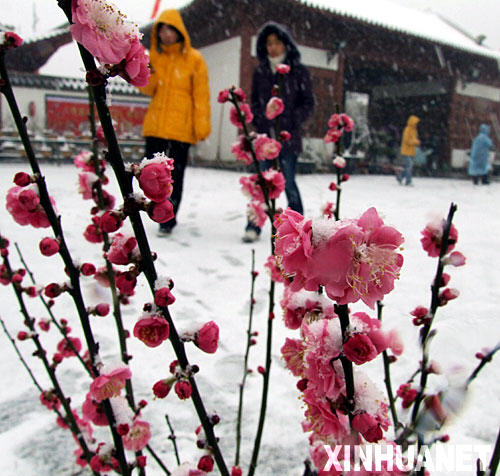 当日,2008中国武汉梅花节在湖北武汉东湖梅园开幕,姿态各异的梅花傲雪绽放,游客可观赏到上百种来自美国、日本等地的珍贵梅花品种。中国武汉梅花节自1983年举办以来,至今举办26届,并已成为人们新春祈福、休闲娱乐的大型文化活动之一,本届梅花节将持续至3月10日。 新华社发