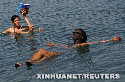 3月23日,在以色列恩盖迪,两名游客在死海中享受在水中漂浮的乐趣。新华社/路透