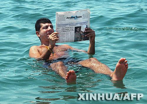 这张1999年8月31日拍摄的资料照片显示了一名游客在死海里看报纸。新华社/法新