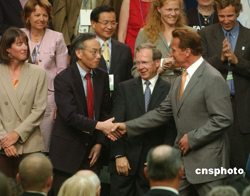 资料图:美国加州州长施瓦辛格出席旧金山市为联合国世界环境日举办的《加州的未来》演讲会,与著名美籍华人科学家朱棣文握手问好。(中新社发 贾国荣 摄)