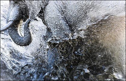比赛冠军作品是在博茨瓦纳丘比国家公园抓拍到的另一头大象和一头巨大非洲野牛的照片。英国摄影家本·奥斯波尔尼花了三周时间对一个取水点进行监控,并抓拍下大象用自己的鼻子在泥水中戏水的照片。