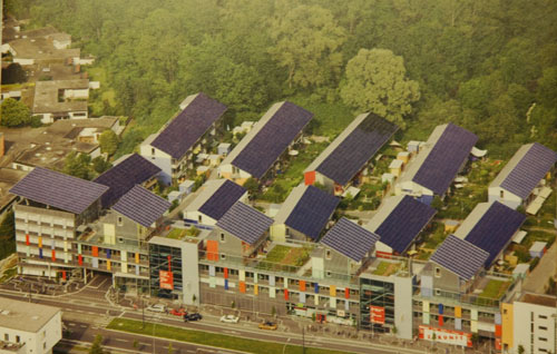 从空中俯瞰,这是一座拥有15栋顶部楼房的大型建筑,3排,每排5座顶楼,依山而建,置身于一片翠绿之中,仿佛“林中之船”,它是欧洲最先进的太阳能住宅小区之一,设计者将此命名为“太阳船”(见图1,资料照片)。它位于弗莱堡城市的南部。
