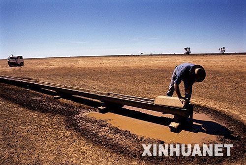 这是2007年2月2日,在澳大利亚新南威尔士州的德尼利昆,农场主沃克在检查水槽。广阔的澳大利亚内陆地区正在经受着干旱的袭击。 新华社发