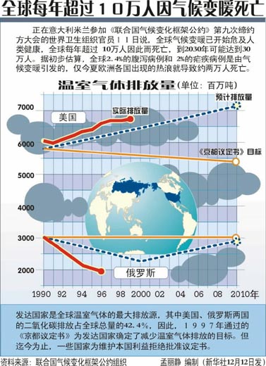 2000年11月份在海牙召开的第6次缔约方大会期间,世界上最大的温室气体排放国美国坚持要大幅度折扣它的减排指标,因而使会议陷入僵局,大会主办者不得不宣布休会,将会议延期到2001年7月在波恩继续举行。2001年10月,第7次缔约方大会在摩洛哥马拉喀什举行。2002年10月,第8次缔约方大会在印度新德里举行。会议通过的《德里宣言》,强调应对气候变化必须在可持续发展的框架内进行。2003年12月,第9次缔约方大会在意大利米兰举行。这些国家和地区温室气体排放量占世界总量的60%。2004年12月,第10次缔约方大会在阿根廷布宜诺斯艾利斯举行。2005年11月,第11次缔约方大会在加拿大蒙特利尔市举行。2006年11月6日,2006联合国气候变化大会在肯尼亚首都内罗毕开幕,大会期间将举行《联合国气候变化框架公约》第12次缔约方大会和《京都议定书》缔约方第2次会议等一系列关于全球气候问题的国际会议。2006联合国气候变化大会的主要议题是“后京都”问题,即2012年之后如何进一步降低温室气体的排放。