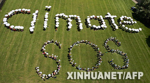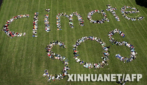 12月8日,在新西兰的奥克兰,来自85个国家和地区的350名环保人士组成“气候急救”的字样,向日前在印度尼西亚巴厘岛召开的联合国气候变化大会传达他们要求保护环境的信息。(新华社/法新)