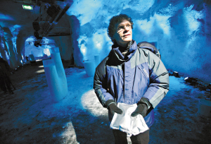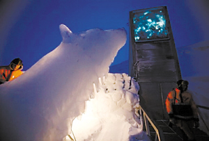 | 装饰有北极熊冰雕的冷藏库入口。 |