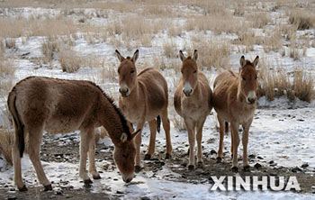 新疆天山野生动物园中的几只野驴正在“聚会”(2007年1月9日摄)。新华社记者 王菲 摄