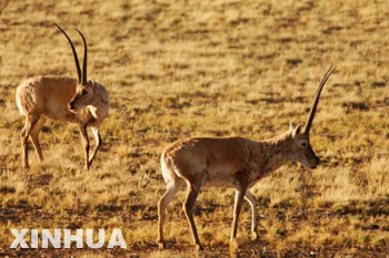 2007年6月29日,两只藏羚羊在青藏铁路边觅食。 新华社记者 嘎吗 摄