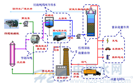 另外,水热干化污泥处理组合技术还通过机械浓缩、水热反应、二次浓缩、脱水、冷-热泥换热、焚烧等技术的组合,实现系统的优化,从而进一步提高了系统整体的处理效率、降低了污泥中有害物质的含量、减轻了后续脱水处理的水负荷、降低了水热处理的能耗、提高了脱水泥饼的热值。