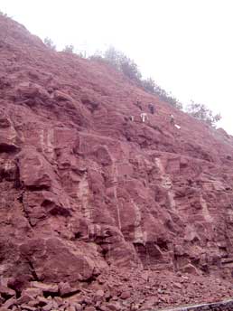 | 施工人员正在高、陡、险的石质边坡上施工 |