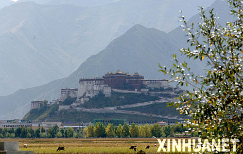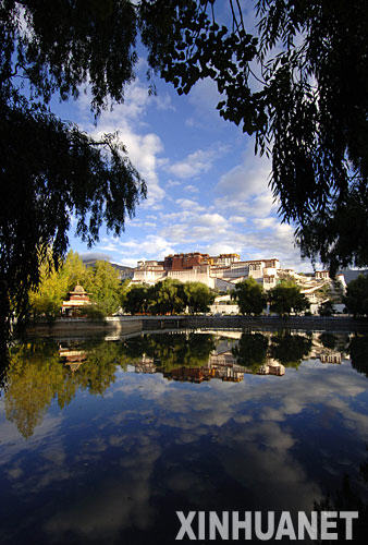 这是蓝天白云、碧水绿树映衬下的西藏布达拉宫(9月22日摄)。